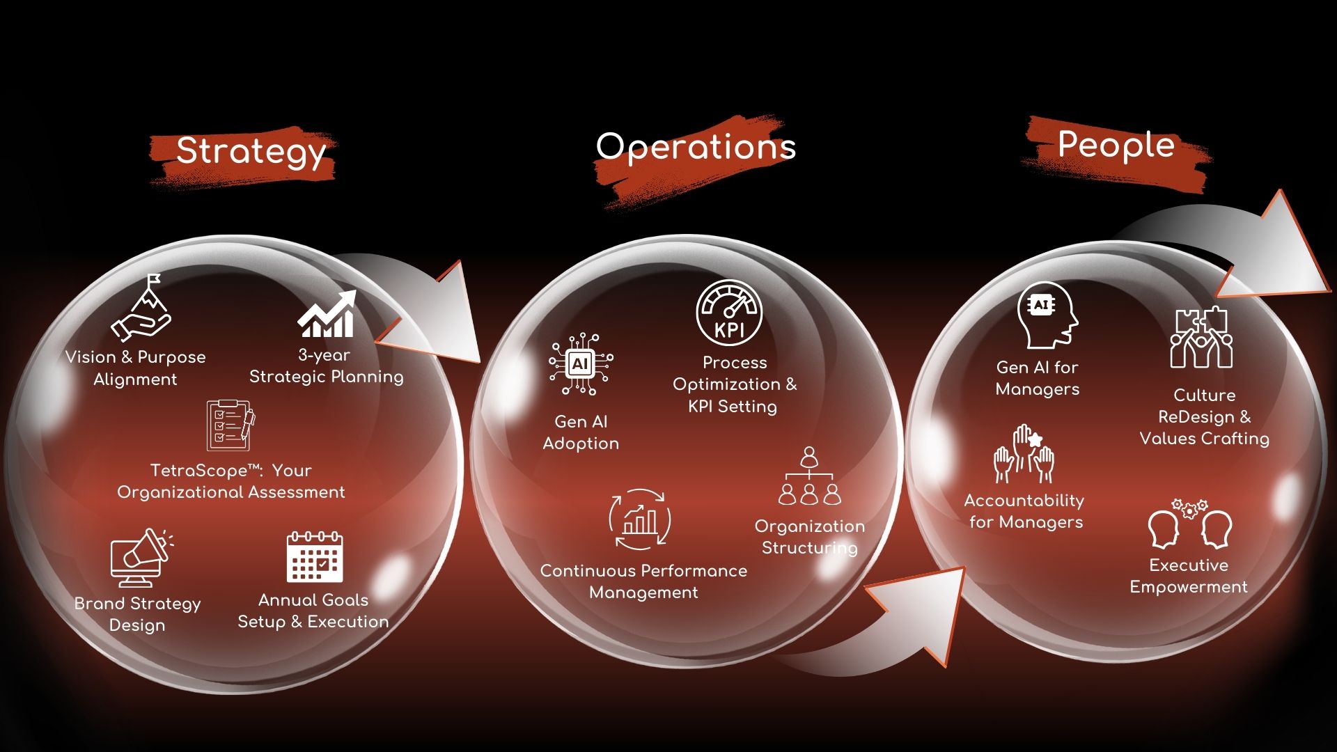 We enable business owners, executives, and CEOs to establish a clear vision and mission, identify strategic pillars (winning strategies), and make strategic OKRs (big bets)